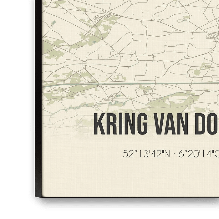 Retro plattegrond van Kring van Dorth, gelegen in de Achterhoek, in de gemeente Lochem, provincie Gelderland. Op de landkaart zijn de openbare wegen, waterlopen (meren, beken en sloten) en bossen in en rondom Kring van Dorth weergeven. Verder is de kaart voorzien van de coördinaten van Kring van Dorth.