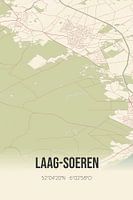 Retro plattegrond van Laag-Soeren, gelegen in regio Rivierenland, in de gemeente Rheden, provincie Gelderland. Op de landkaart zijn de openbare wegen, waterlopen (meren, beken en sloten) en bossen in en rondom Laag-Soeren weergeven. Verder is de kaart voorzien van de coördinaten van Laag-Soeren.