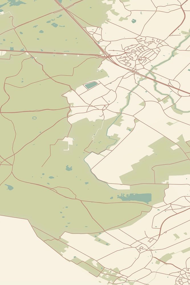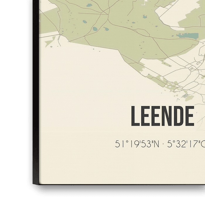 Retro plattegrond van Leende, gelegen in de gemeente Heeze-Leende, provincie Noord-Brabant. Op de landkaart zijn de openbare wegen, waterlopen (meren, beken en sloten) en bossen in en rondom Leende weergeven. Verder is de kaart voorzien van de coördinaten van Leende.