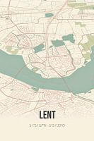Retro plattegrond van Lent, gelegen in regio Rivierenland, in de gemeente Nijmegen, provincie Gelderland. Op de landkaart zijn de openbare wegen, waterlopen (meren, beken en sloten) en bossen in en rondom Lent weergeven. Verder is de kaart voorzien van de coördinaten van Lent.
