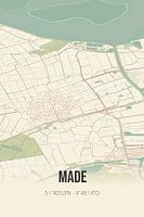 Retro plattegrond van Made, gelegen in de gemeente Drimmelen, provincie Noord-Brabant. Op de landkaart zijn de openbare wegen, waterlopen (meren, beken en sloten) en bossen in en rondom Made weergeven. Verder is de kaart voorzien van de coördinaten van Made.