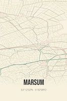 Retro plattegrond van Marsum, gelegen in de gemeente Waadhoeke, provincie Fryslan. Op de landkaart zijn de openbare wegen, waterlopen (meren, beken en sloten) en bossen in en rondom Marsum weergeven. Verder is de kaart voorzien van de coördinaten van Marsum.