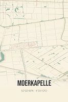 Retro plattegrond van Moerkapelle, gelegen in de gemeente Zuidplas, provincie Zuid-Holland. Op de landkaart zijn de openbare wegen, waterlopen (meren, beken en sloten) en bossen in en rondom Moerkapelle weergeven. Verder is de kaart voorzien van de coördinaten van Moerkapelle.
