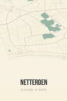 Retro plattegrond van Netterden, gelegen in de Liemers, in de gemeente Oude IJsselstreek, provincie Gelderland. Op de landkaart zijn de openbare wegen, waterlopen (meren, beken en sloten) en bossen in en rondom Netterden weergeven. Verder is de kaart voorzien van de coördinaten van Netterden.