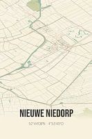 Retro plattegrond van Nieuwe Niedorp, gelegen in de gemeente Hollands Kroon, provincie Noord-Holland. Op de landkaart zijn de openbare wegen, waterlopen (meren, beken en sloten) en bossen in en rondom Nieuwe Niedorp weergeven. Verder is de kaart voorzien van de coördinaten van Nieuwe Niedorp.