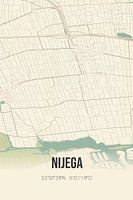 Retro plattegrond van Nijega, gelegen in de gemeente Smallingerland, provincie Fryslan. Op de landkaart zijn de openbare wegen, waterlopen (meren, beken en sloten) en bossen in en rondom Nijega weergeven. Verder is de kaart voorzien van de coördinaten van Nijega.