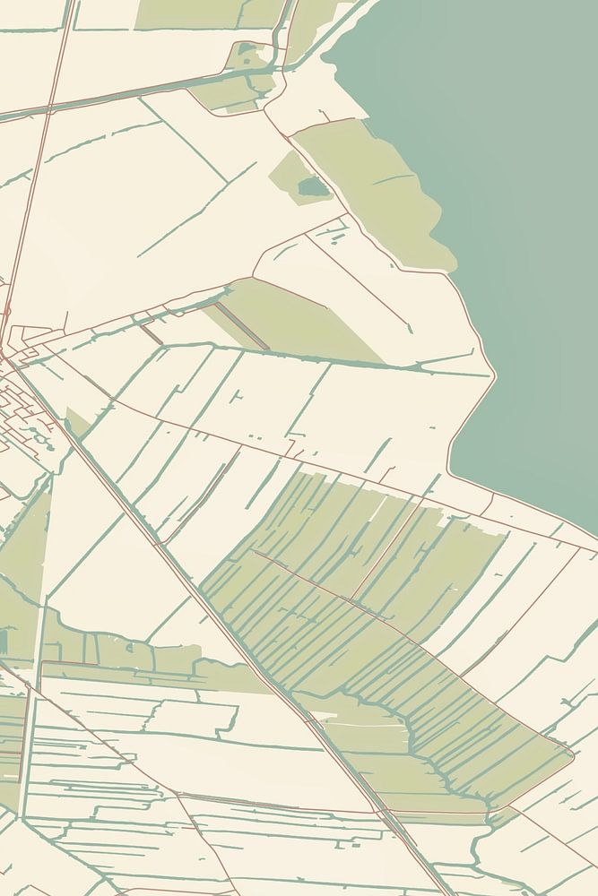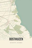 Retro plattegrond van Oosthuizen, gelegen in de gemeente Edam-Volendam, provincie Noord-Holland. Op de landkaart zijn de openbare wegen, waterlopen (meren, beken en sloten) en bossen in en rondom Oosthuizen weergeven. Verder is de kaart voorzien van de coördinaten van Oosthuizen.