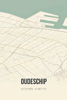 Retro plattegrond van Oudeschip, gelegen in de gemeente Het Hogeland, provincie Groningen. Op de landkaart zijn de openbare wegen, waterlopen (meren, beken en sloten) en bossen in en rondom Oudeschip weergeven. Verder is de kaart voorzien van de coördinaten van Oudeschip.