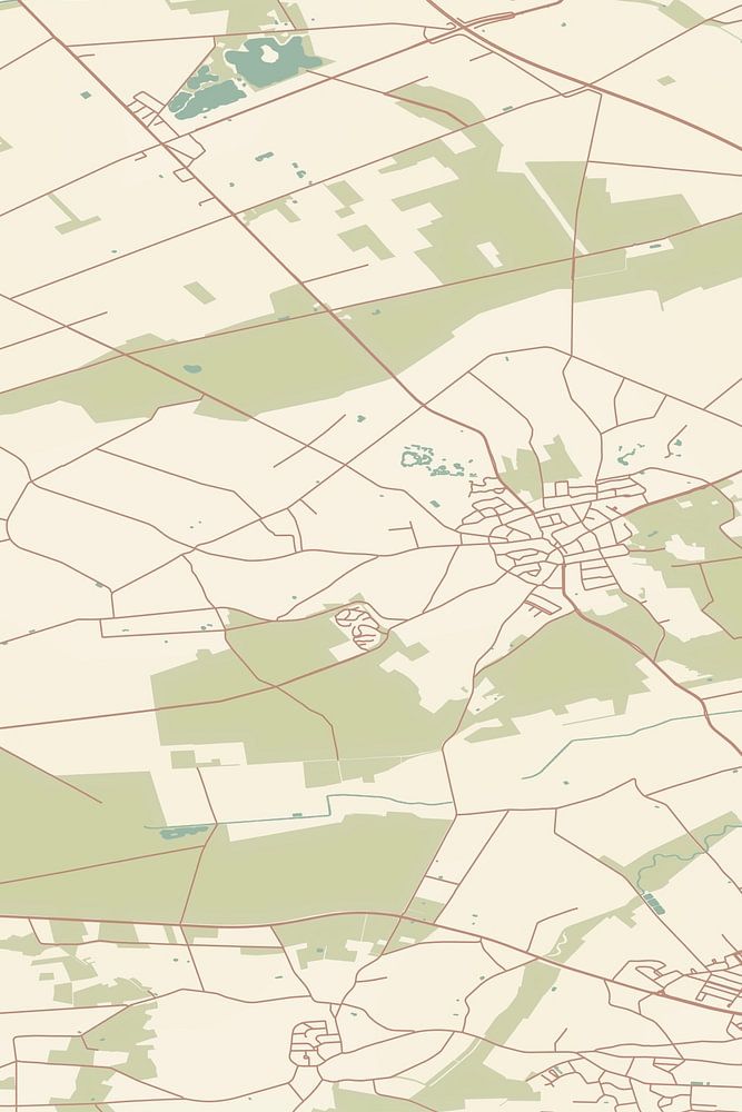 Retro plattegrond van Overloon, gelegen in de Peel, in de gemeente Boxmeer, provincie Noord-Brabant. Op de landkaart zijn de openbare wegen, waterlopen (meren, beken en sloten) en bossen in en rondom Overloon weergeven. Verder is de kaart voorzien van de coördinaten van Overloon.