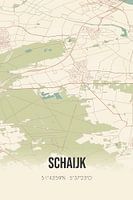 Retro plattegrond van Schaijk, gelegen in de gemeente Landerd, provincie Noord-Brabant. Op de landkaart zijn de openbare wegen, waterlopen (meren, beken en sloten) en bossen in en rondom Schaijk weergeven. Verder is de kaart voorzien van de coördinaten van Schaijk.