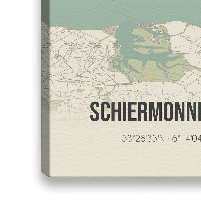 Retro plattegrond van Schiermonnikoog, gelegen op de Wadden, in de gemeente Schiermonnikoog, provincie Fryslan. Op de landkaart zijn de openbare wegen, waterlopen (meren, beken en sloten) en bossen in en rondom Schiermonnikoog weergeven. Verder is de kaart voorzien van de coördinaten van Schiermonnikoog.