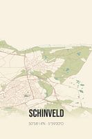 Retro plattegrond van Schinveld, gelegen in de gemeente Beekdaelen, provincie Limburg. Op de landkaart zijn de openbare wegen, waterlopen (meren, beken en sloten) en bossen in en rondom Schinveld weergeven. Verder is de kaart voorzien van de coördinaten van Schinveld.