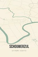 Retro plattegrond van Schouwerzijl, gelegen in de gemeente Het Hogeland, provincie Groningen. Op de landkaart zijn de openbare wegen, waterlopen (meren, beken en sloten) en bossen in en rondom Schouwerzijl weergeven. Verder is de kaart voorzien van de coördinaten van Schouwerzijl.