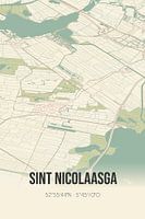 Retro plattegrond van Sint Nicolaasga, gelegen in de gemeente De Fryske Marren, provincie Fryslan. Op de landkaart zijn de openbare wegen, waterlopen (meren, beken en sloten) en bossen in en rondom Sint Nicolaasga weergeven. Verder is de kaart voorzien van de coördinaten van Sint Nicolaasga.