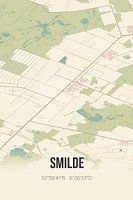 Retro plattegrond van Smilde, gelegen in de gemeente Midden-Drenthe, provincie Drenthe. Op de landkaart zijn de openbare wegen, waterlopen (meren, beken en sloten) en bossen in en rondom Smilde weergeven. Verder is de kaart voorzien van de coördinaten van Smilde.