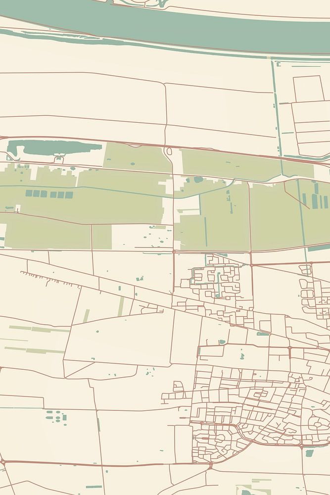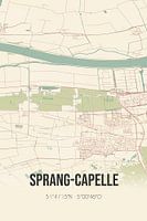 Retro plattegrond van Sprang-Capelle, gelegen in de gemeente Waalwijk, provincie Noord-Brabant. Op de landkaart zijn de openbare wegen, waterlopen (meren, beken en sloten) en bossen in en rondom Sprang-Capelle weergeven. Verder is de kaart voorzien van de coördinaten van Sprang-Capelle.