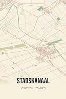 Retro plattegrond van Stadskanaal, gelegen in de gemeente Stadskanaal, provincie Groningen. Op de landkaart zijn de openbare wegen, waterlopen (meren, beken en sloten) en bossen in en rondom Stadskanaal weergeven. Verder is de kaart voorzien van de coördinaten van Stadskanaal.