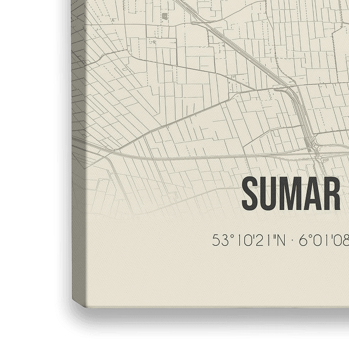 Retro plattegrond van Sumar, gelegen in de gemeente Tytsjerksteradiel, provincie Fryslan. Op de landkaart zijn de openbare wegen, waterlopen (meren, beken en sloten) en bossen in en rondom Sumar weergeven. Verder is de kaart voorzien van de coördinaten van Sumar.