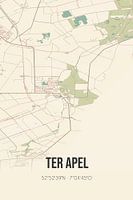 Retro plattegrond van Ter Apel, gelegen in de gemeente Westerwolde, provincie Groningen. Op de landkaart zijn de openbare wegen, waterlopen (meren, beken en sloten) en bossen in en rondom Ter Apel weergeven. Verder is de kaart voorzien van de coördinaten van Ter Apel.