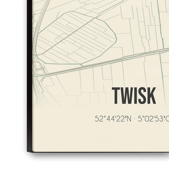Retro plattegrond van Twisk, gelegen in de gemeente Medemblik, provincie Noord-Holland. Op de landkaart zijn de openbare wegen, waterlopen (meren, beken en sloten) en bossen in en rondom Twisk weergeven. Verder is de kaart voorzien van de coördinaten van Twisk.