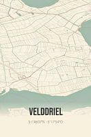 Retro plattegrond van Velddriel, gelegen in de Betuwe, in de gemeente Maasdriel, provincie Gelderland. Op de landkaart zijn de openbare wegen, waterlopen (meren, beken en sloten) en bossen in en rondom Velddriel weergeven. Verder is de kaart voorzien van de coördinaten van Velddriel.