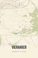 Retro plattegrond van Vierakker, gelegen in de Achterhoek, in de gemeente Bronckhorst, provincie Gelderland. Op de landkaart zijn de openbare wegen, waterlopen (meren, beken en sloten) en bossen in en rondom Vierakker weergeven. Verder is de kaart voorzien van de coördinaten van Vierakker.
