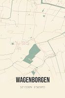 Retro plattegrond van Wagenborgen, gelegen in de gemeente Delfzijl, provincie Groningen. Op de landkaart zijn de openbare wegen, waterlopen (meren, beken en sloten) en bossen in en rondom Wagenborgen weergeven. Verder is de kaart voorzien van de coördinaten van Wagenborgen.