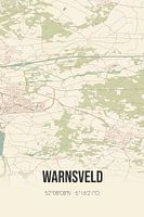 Retro plattegrond van Warnsveld, gelegen in de Achterhoek, in de gemeente Zutphen, provincie Gelderland. Op de landkaart zijn de openbare wegen, waterlopen (meren, beken en sloten) en bossen in en rondom Warnsveld weergeven. Verder is de kaart voorzien van de coördinaten van Warnsveld.