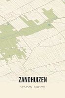 Retro plattegrond van Zandhuizen, gelegen in de gemeente Weststellingwerf, provincie Fryslan. Op de landkaart zijn de openbare wegen, waterlopen (meren, beken en sloten) en bossen in en rondom Zandhuizen weergeven. Verder is de kaart voorzien van de coördinaten van Zandhuizen.