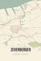 Retro plattegrond van Zevenbergen, gelegen in de gemeente Moerdijk, provincie Noord-Brabant. Op de landkaart zijn de openbare wegen, waterlopen (meren, beken en sloten) en bossen in en rondom Zevenbergen weergeven. Verder is de kaart voorzien van de coördinaten van Zevenbergen.