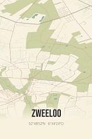 Retro plattegrond van Zweeloo, gelegen in de gemeente Coevorden, provincie Drenthe. Op de landkaart zijn de openbare wegen, waterlopen (meren, beken en sloten) en bossen in en rondom Zweeloo weergeven. Verder is de kaart voorzien van de coördinaten van Zweeloo.