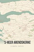 Retro plattegrond van 's-Heer Arendskerke, gelegen in de gemeente Goes, provincie Zeeland. Op de landkaart zijn de openbare wegen, waterlopen (meren, beken en sloten) en bossen in en rondom 's-Heer Arendskerke weergeven. Verder is de kaart voorzien van de coördinaten van 's-Heer Arendskerke.