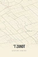 Retro plattegrond van 't Zandt, gelegen in de gemeente Loppersum, provincie Groningen. Op de landkaart zijn de openbare wegen, waterlopen (meren, beken en sloten) en bossen in en rondom 't Zandt weergeven. Verder is de kaart voorzien van de coördinaten van 't Zandt.