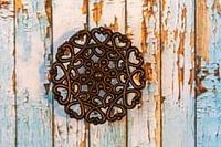 Deze cirkel van hartjes is een deurknopje wat aan een oude kast zat. De oude kast was dusdanig versleten dat deze niet meer bruikbaar was, maar de deurknopjes vond ik zo mooi dat ik ze moest bewaren en koesteren.