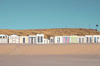 Strandhuisjes bij zonsondergang in Wijk aan zee. Fleurige pastel kleuren en een retro vintage vibe in de kleuren van de lucht.