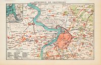 Op deze antieke kaart uit ca. 1900 staat een plattegrond van de stad Antwerpen en omgeving. Deze stadskaart is in kleur.