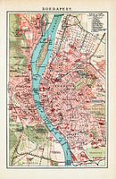 Op deze antieke kaart uit ca. 1900 staat een plattegrond van de stad Boedapest. Deze stadskaart is in kleur.