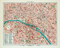 Op deze antieke kaart uit ca. 1900 staat een plattegrond van de stad Parijs. Het betreft het centrum van de stad. Deze stadskaart is in kleur. Er is een lijst met de belangrijkste gebouwen en monumenten opgenomen.