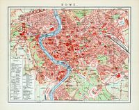 Op deze antieke kaart uit ca. 1900 staat een plattegrond van de stad Rome. Deze stadskaart is in kleur.