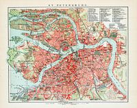 Op deze antieke kaart uit ca. 1900 staat een plattegrond van de stad St. Petersburg. Deze stadskaart is in kleur. De belangrijkste plaatsen en monumenten staan vermeld in een apart katern.