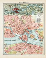 Op deze antieke kaart uit ca. 1900 staat een plattegrond van Stockholm. Deze stadskaart is in kleur.