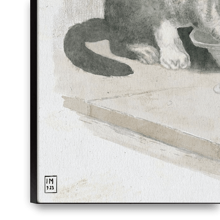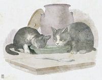 De basis van dit poezentafereeltje is een illustratie uit een kinderboek uit de 19e eeuw. Deze is opnieuw getekend en voorzien van poederachtige, vintage kleuren.