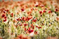 Een veld klaprozen in een vintage smaakje op een warme en zonnige zomer ochtend in het Zuid Limburgse Heuvelland