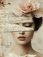 Dit kunstwerk toont een vrouwelijk gezicht gedeeltelijk bedekt met gescheurde stukken papier en een roze roos. Het papier lijkt oude teksten en afbeeldingen te bevatten, wat een gevoel van vergankelijkheid en herinnering oproept. De combinatie van de zachte, natuurlijke tinten en de fragiele elementen zoals de roos en het papier creëren…