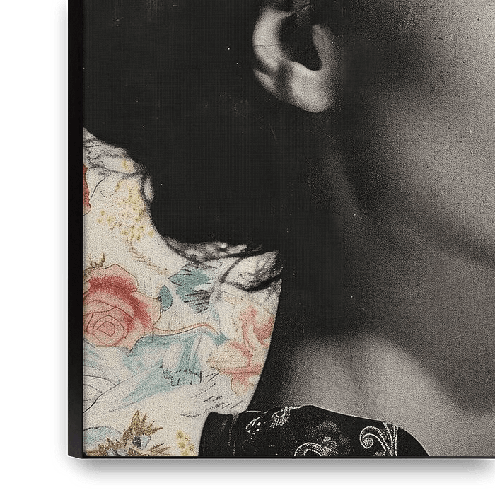 Vintage portret van een jonge vrouw in zwart-wit en verweerde stijl met gekleurde bloemen. Kies zelf het formaat en materiaal bij dit werk en maak er een echte blikvanger van voor jouw interieur.