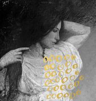 Jonge mooie vrouw in zwart-wit en gouden elementen.