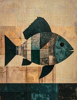 Dit kunstwerk toont een gestileerde vis die is opgebouwd uit geometrische vormen en een patchwork van kleurvlakken.