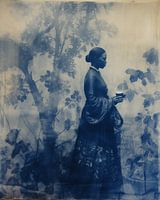 Verweerde vintage print in blauw van een vrouw in een tropisch landschap. Een echte blikvanger voor aan je muur. Ook heel erg gaaf als behang.