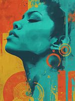 Het kleurenpalet is bewust gericht op complementaire kleuren - het koele turquoise van de huid vibreert letterlijk met de warme oranje, rode en gele tinten van de omgeving. Deze kleurkeuze creëert een elektriserende spanning die onmiddellijk de aandacht van de kijker trekt en een emotionele reactie oproept. De geometrische overlay-elementen versterken dit effect en laten het werk eruit zien als een mix van vintage design en modern vakmanschap.