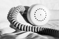 Zwart-witfoto van een vintage bakelieten telefoon met spiraaldraden. Deze coole retrofoto van een klassiek stilleven roept herinneringen op aan de jaren 1970 en is perfect om aan je muur te hangen.